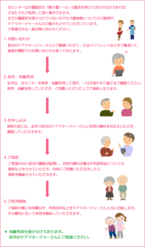 デイサービスとは、認知症の緩和や身体の機能の維持・向上だけではなく、新しいお友達とお話を楽しまれたり、工作や習字など楽しみを見つけることを目的に、日帰りで利用する介護保険サービスです。