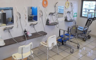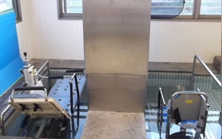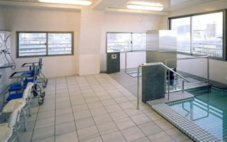 中間浴では浴槽の側面が可動式になっている為浴槽を跨ぐ必要が無く、浴槽内にはゆっくりと上昇・下降する椅子が付いている為安全に入浴する事が出来ます。 |