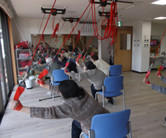 天井から吊るした赤い紐を使用し、安全・効果的にできる機能訓練。